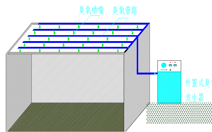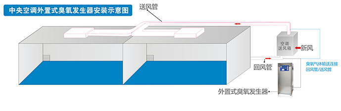 外置式ER-KXW系列臭氧发生器结合新风通道或加设喷射头循环风道即可对车间进行杀毒消菌。用户可自备无油洁净气源或配置无油空压机,臭氧发生器放置在中央空调机组旁边或者机房,在机组回风管上开孔,臭氧输出口用软管或硬管连接,导入到回风管内。