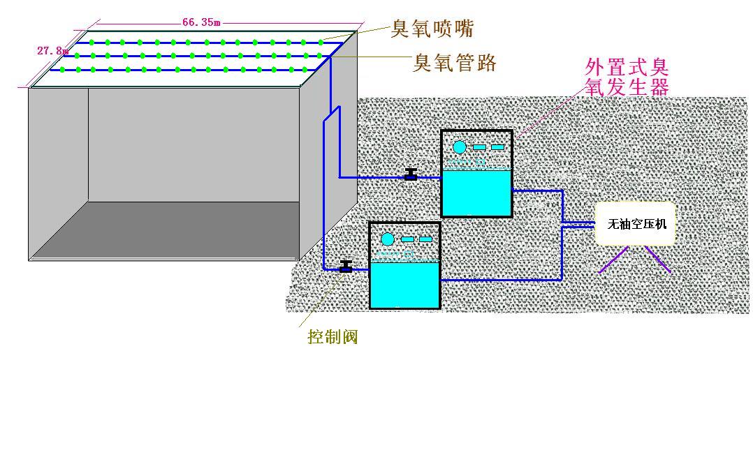 外置式ER-KXW系列臭氧发生器结合新风通道或加设喷射头循环风道即可对车间进行杀毒消菌。用户可自备无油洁净气源或配置无油空压机,臭氧发生器放置在中央空调机组旁边或者机房,在机组回风管上开孔,臭氧输出口用软管或硬管连接,导入到回风管内。