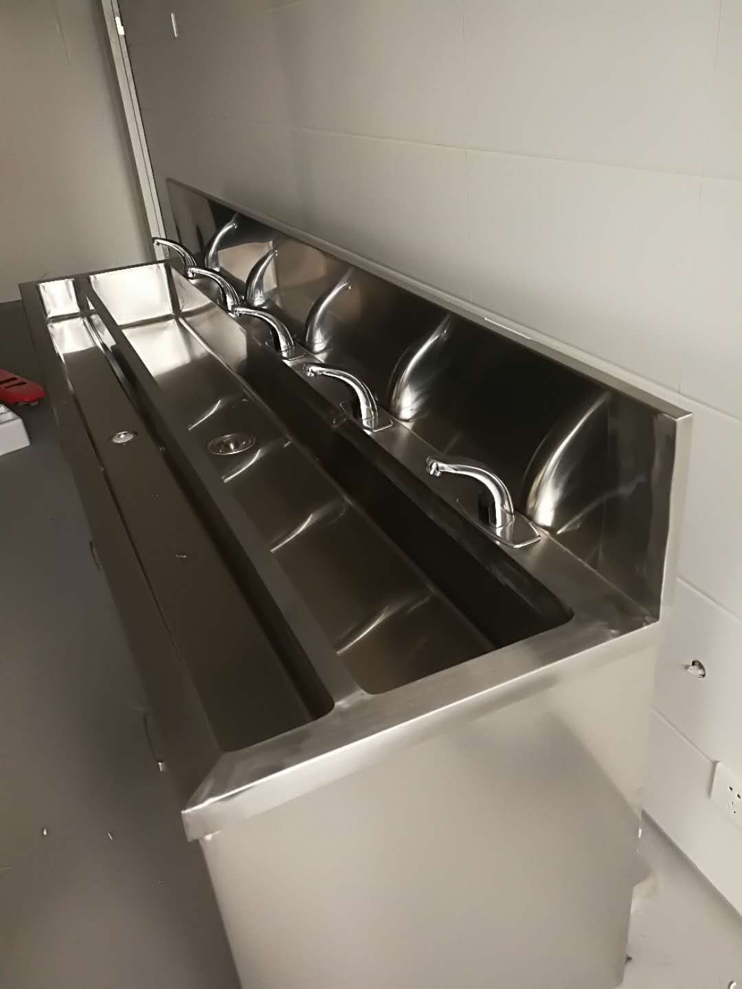 全自动感应洗手池是采用卫生级304不锈钢制作,经久耐用,安全可靠,整体采用无缝设计,极易清洁,红外线系统感应度高,抗干性强,保证了操作人员的使用安全。可根据客户要求出水模式可采用红外线感应、腿部触碰和脚踏式控制,也可根据客户要求尺寸定做安全可靠,方便实用